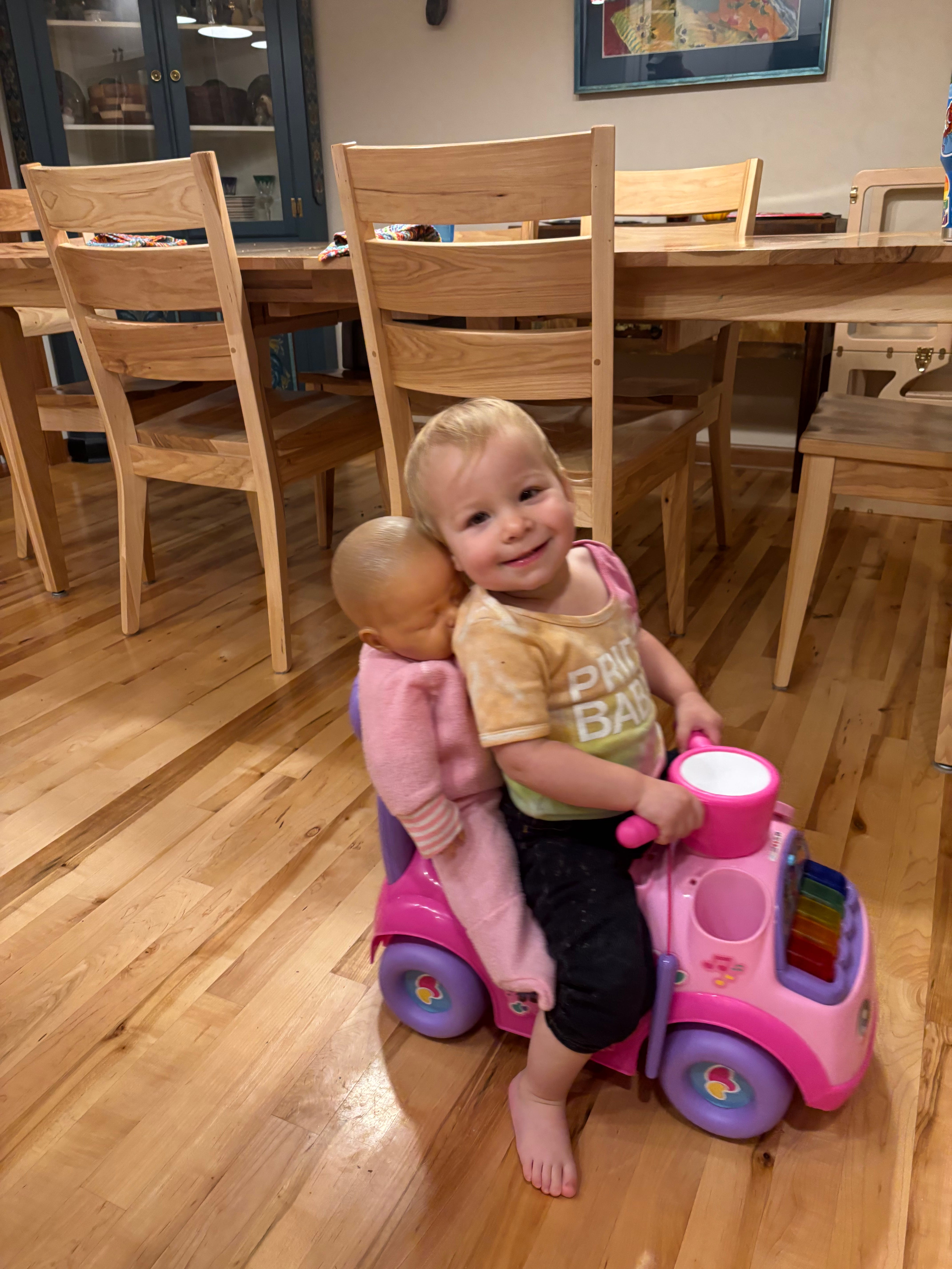 During this shower time, MorMor texts me pictures of you riding on your little pink musical bus with Baby Doll in the backseat. I used to carry that doll everywhere. I love it when you do the same.