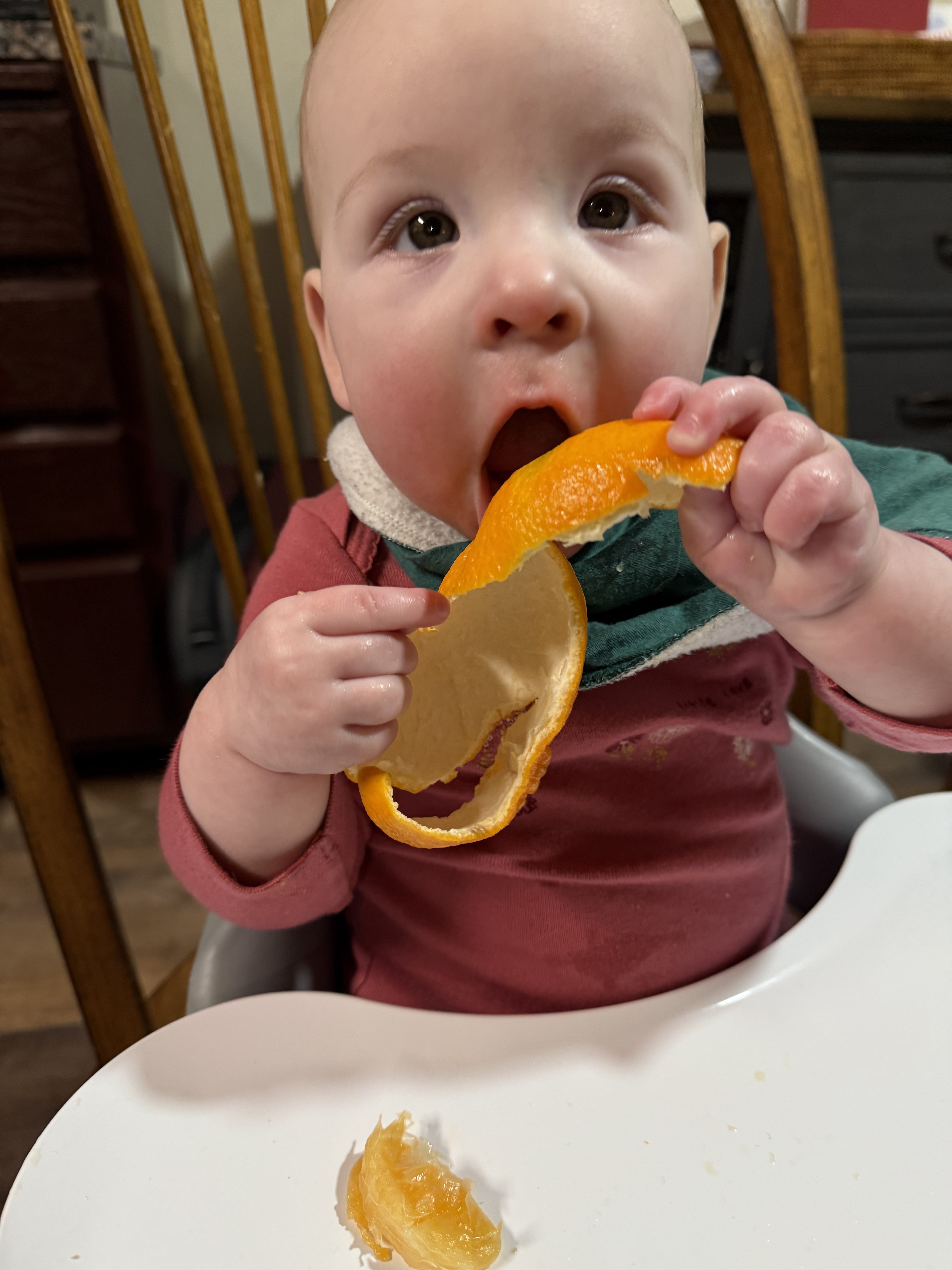 I say it back to you this evening, trying to inspire more babbling — bah, bah, bah. It makes you laugh while you hold onto your orange peel. You sucked the juices out of a slice and then only reached for the rind, having a hoot of a time.
