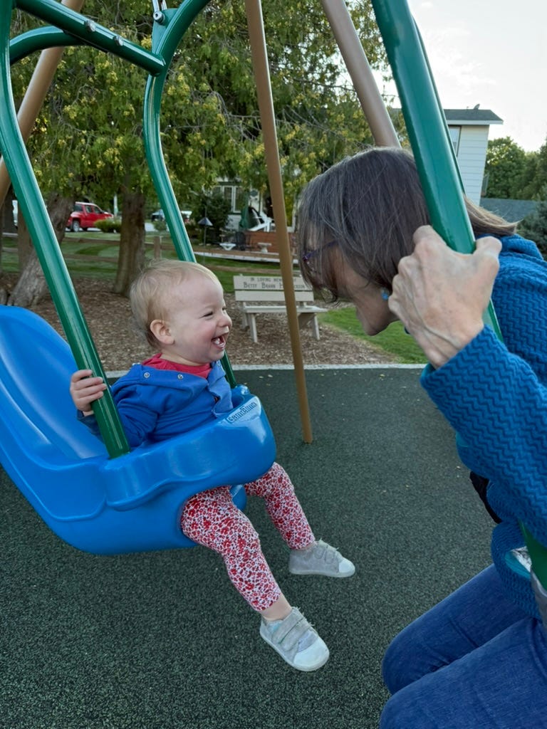 We go to the park afterwards, where you swing with MorMor and then kind of make a friend going up and down the slide. At least, you see what he’s doing and want to imitate it and you both get in each other’s way while we chat with his parents and grandparents. Turns out the two of you were born a week apart, but he’s visiting from out of state.
