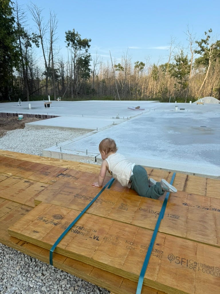 We walk down Mariner Road after dinner. They’ve poured the concrete into the foundation at our future home this week. I hold both your hands while you fast walk all around it. Then you treat the piles of boards as a jungle gym. Soon they’ll be walls.