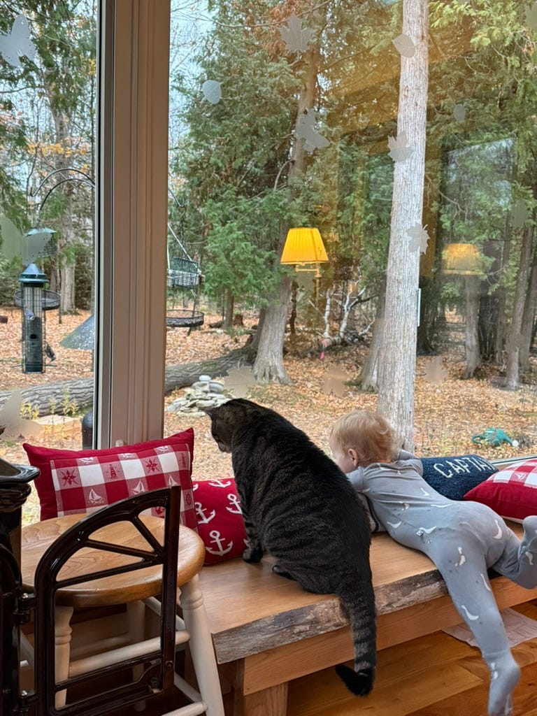 You and Merlin watch the birds and squirrels out of the sunroom window. It’s before 7 am. I’m curled up on the chair, half awake, but I know that is a moment to remember.