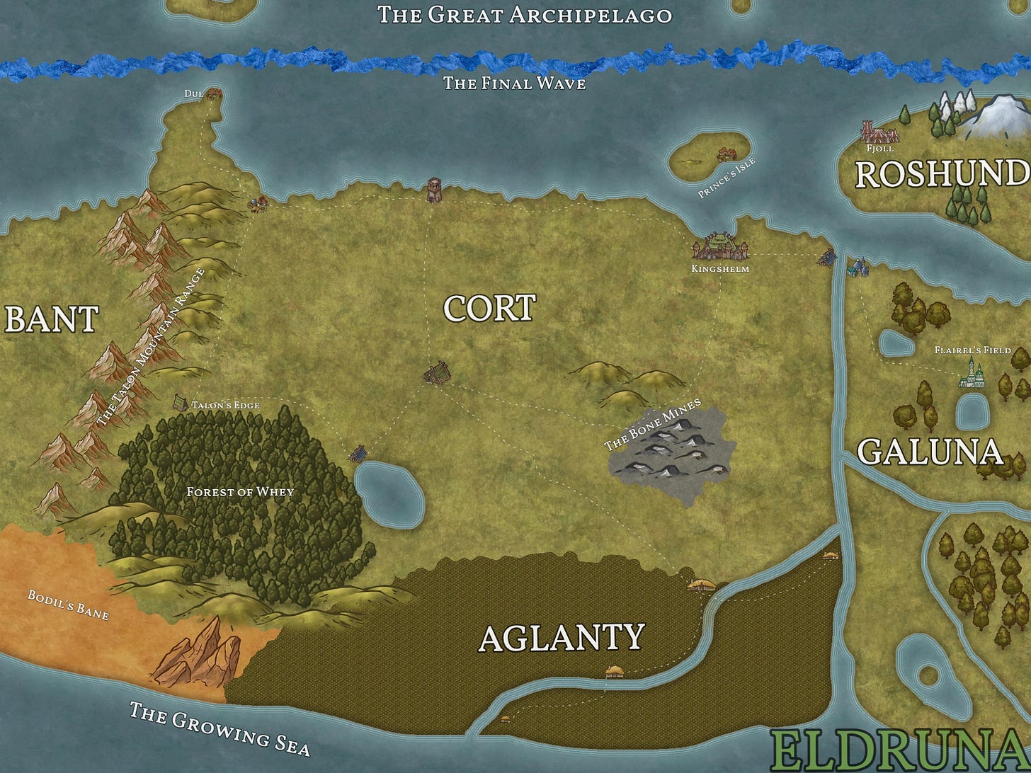 I use an online tool and make a draft of the new world for our upcoming campaign, Eldruna (below). Not pictured: The Great Archipelago and anything above “The Final Wave” that has acted as a magical and physical barrier to the land that once belonged to the dragons.
