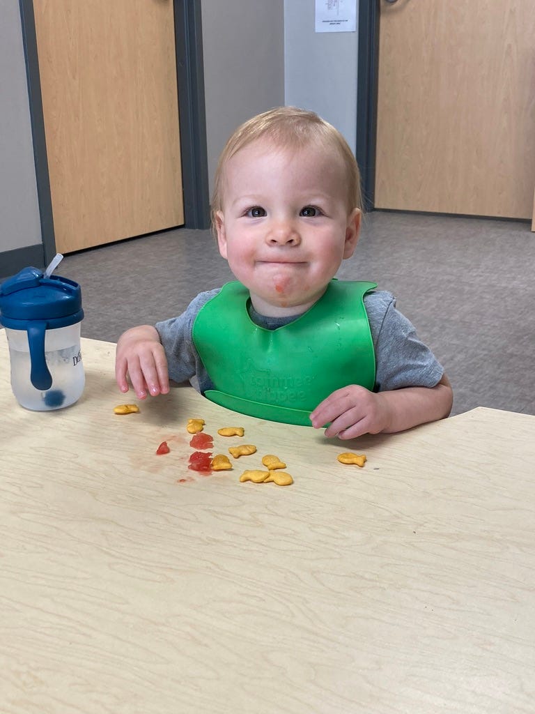 Your teacher texts me this picture of you at snack time. She also mentions you love climbing on the tables outside of mealtimes.