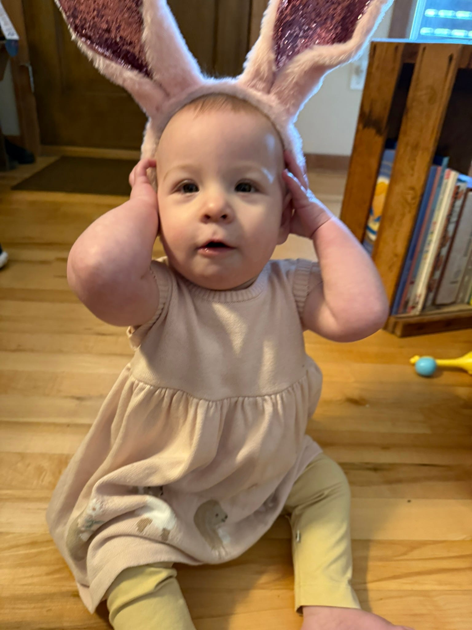 It’s sunny all morning, your first Easter. Your Mama A comes up with your big sister for the night, and we stay at the cottage (more space, even though MorMor and Cappi are in Madison). Last night we ate pizza outside at Pizza Bros — mac & cheese pizza is your favorite, of course. Today, I cook us Easter brunch.