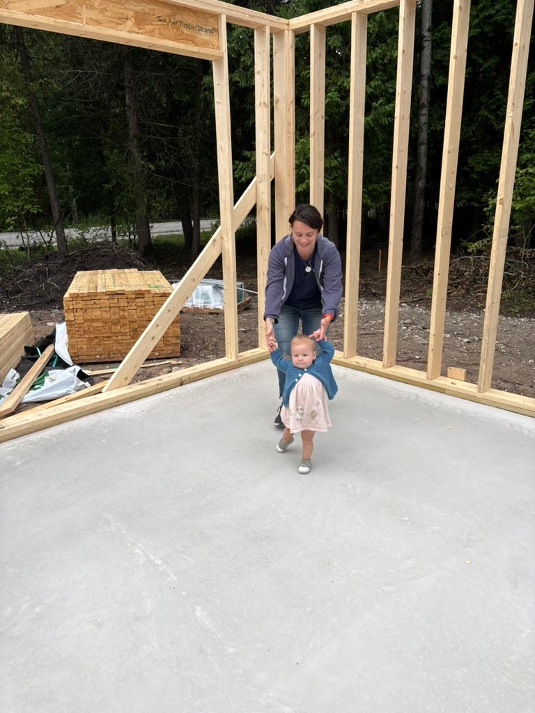 We walk over to our house in progress. The framing for the outside walls are up. Cappi takes a picture of us walking in your future bedroom.