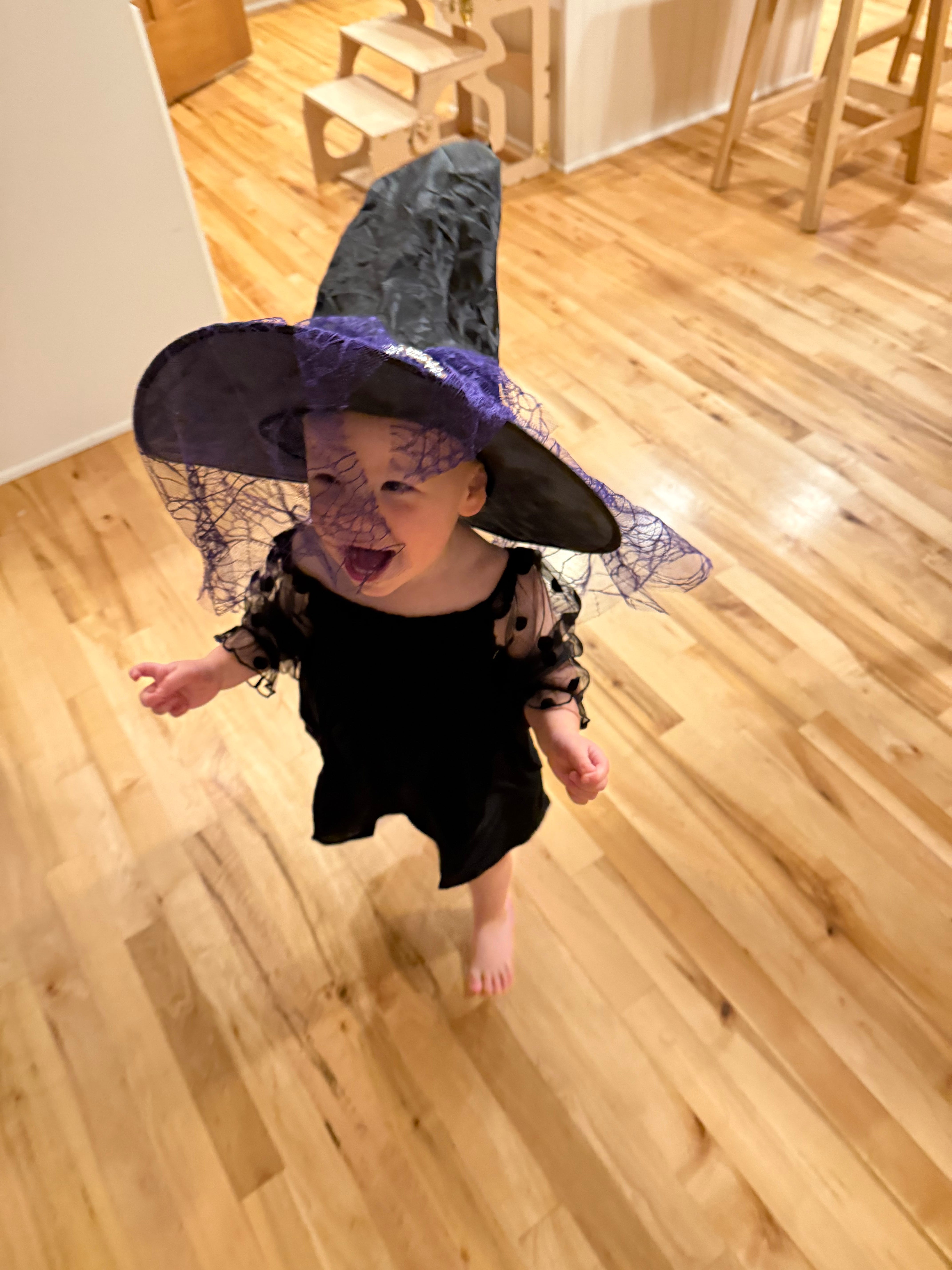 Happy Halloween, my little witch. I had a hard time getting a photo as you ran around this morning in your black dress and too-big witch’s hat, but you were awfully cute. Cappi suggested a witch costume since you love brooms so much. I wore cat ears today as your witch’s familiar.