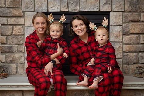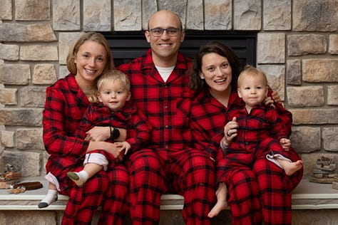 I buy us, Kai, Aunt Amanda, and Uncle Wes classic matching flannel pajamas for the chance to take some kitschy family photos. Wes, with his nice camera, obliges and orchestrates.