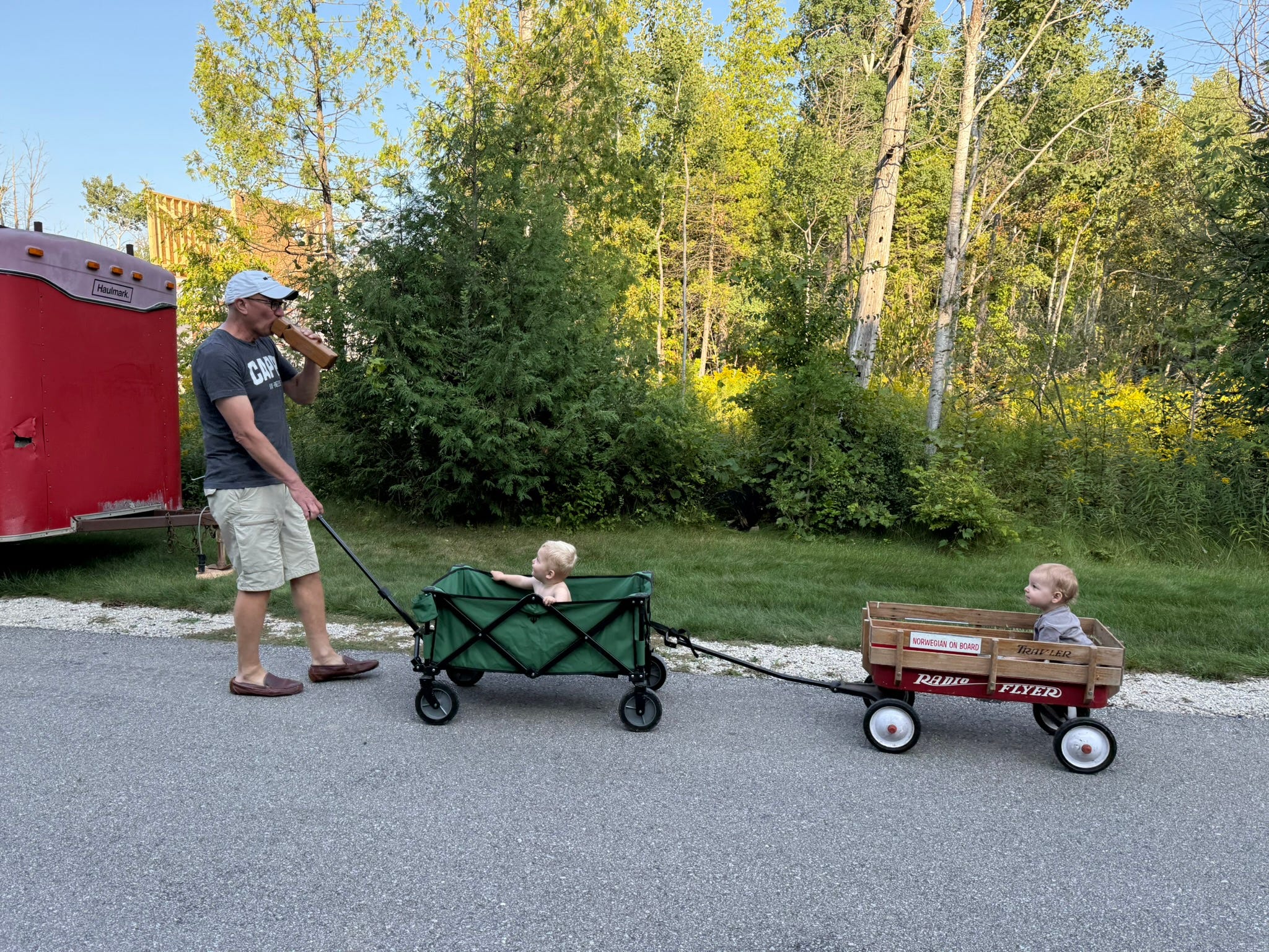 You bike again and get pushed around on “Reese’s Racer” — the pedal go-kart Cappi got for you (and Kai) when you’re a little older. You’re too young to reach the pedals but old enough to hold on if we push you. Cappi figures out how to do this with a walking stick, so we don’t have to bend down. Of course, eventually you’re more interested in getting down and pushing yourself.
