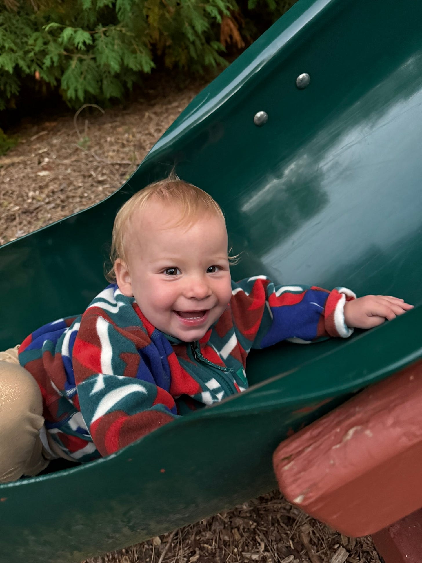 Then you demonstrate how you can climb the whole slide by yourself up to the platform and then slide down. You are rightly very proud of yourself. I hope I remember the smile you gave me after you slid down on your back forever.