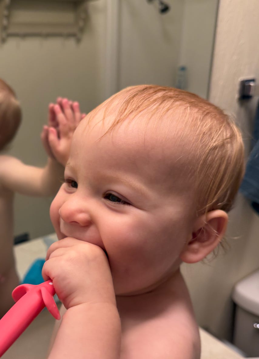 I tell you this, and then we brush your teeth. You are practicing holding the toothbrush yourself and somehow end up sitting in the sink playing in front of the mirror. I get it.