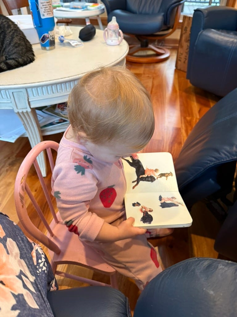 We have a Mama-Daughter Saturday. A quiet one, with the cold and my current energy level, but hopefully a good one for you. We haven’t been to the library in a month, so we go there for an hour this morning. You play in the children’s room, but then have fun walking around the entire building. You only try to pull books off the shelves a few times.