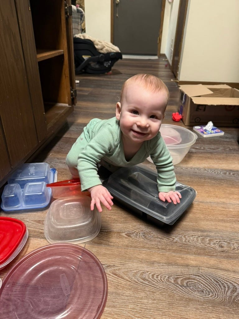 When we get home, I make us mac & cheese since you didn’t eat much real food today, and I know you’ll eat that. You eat so much of it (and then so do I). While I cook and later clean up, you play with the tupperware cabinet and the box of random things I put together for you. We’re listening to a Dungeon Court podcast I’ve heard before. The scene feels good, nonchaotic, and resets my nervous system.