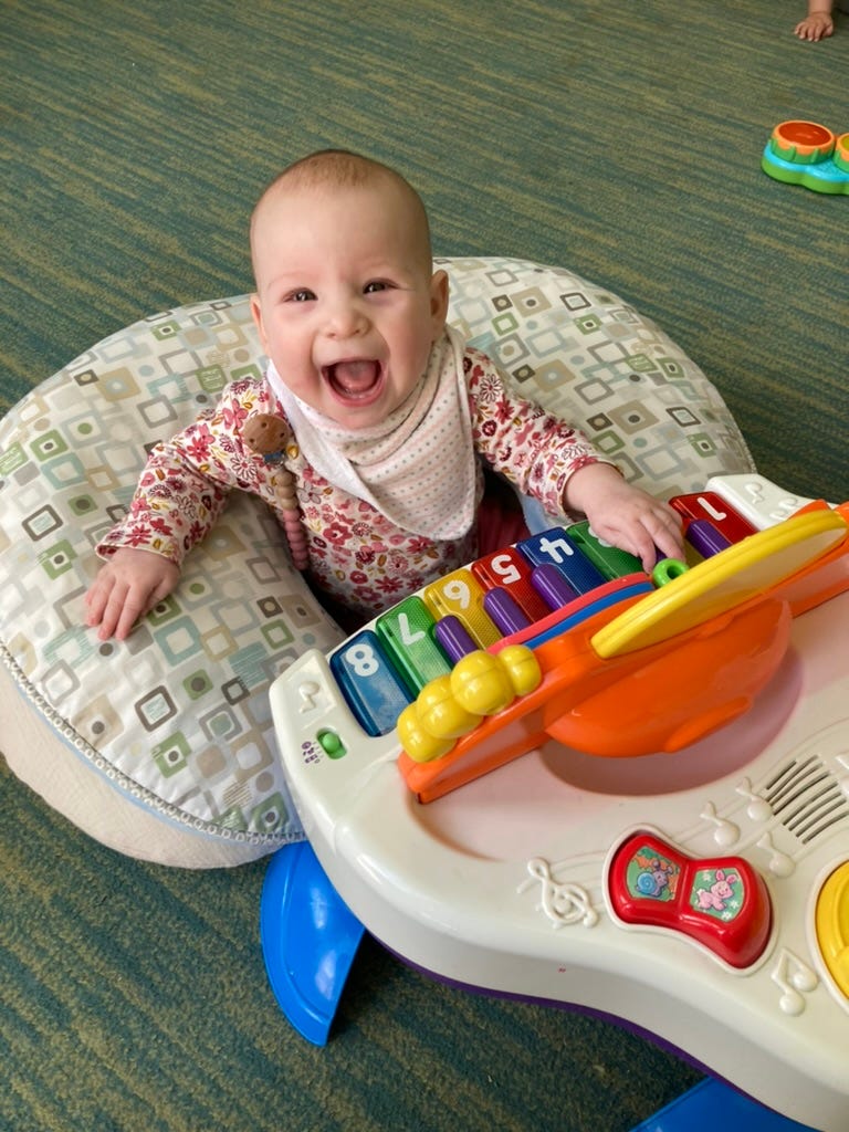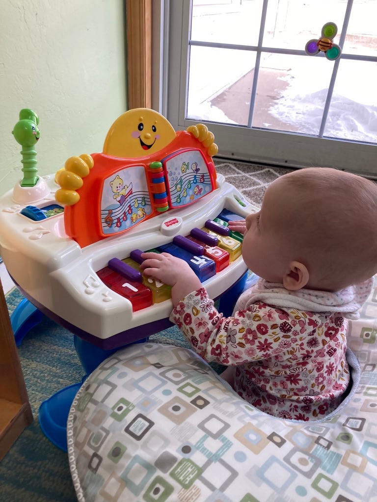 I sit you on my lap to play the piano too, and you bang on the keys for a few seconds before growing bored. One of my favorite pictures of you, taken last December, is you playing with a toy piano at daycare. It’s been my phone background for months. You look so happy to be a little musician.