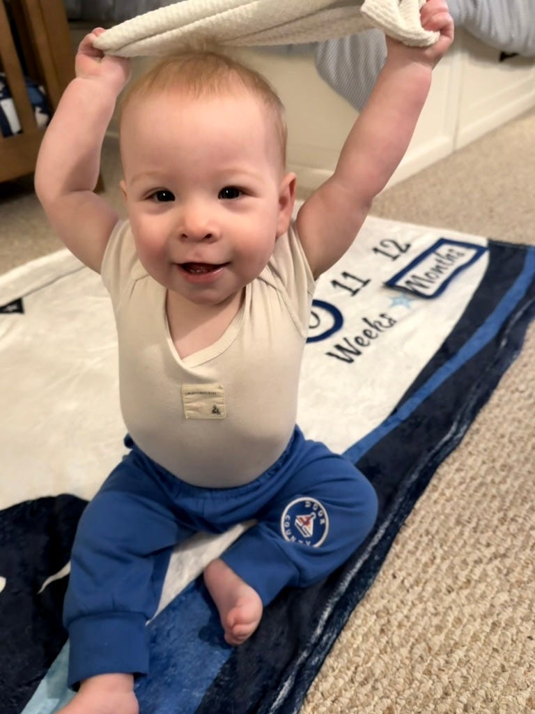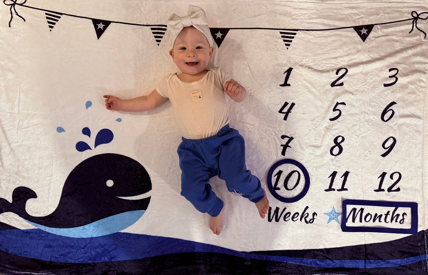 We took your ten-month pictures this morning. A day late, but really you were born in the evening on June 17th, so this is only ten months and twelve hours or so . . .