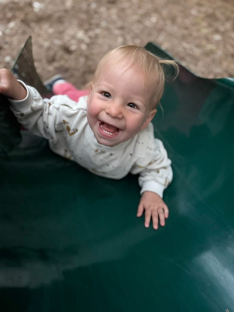 We do manage to play outside for a little bit before the sun sets. You practice climbing the slide and then walk me back to our door when you’re done. Soon, we’ll have to find indoor post-dinner activities as sunset creeps ever earlier. Or we’ll pull out flashlights.