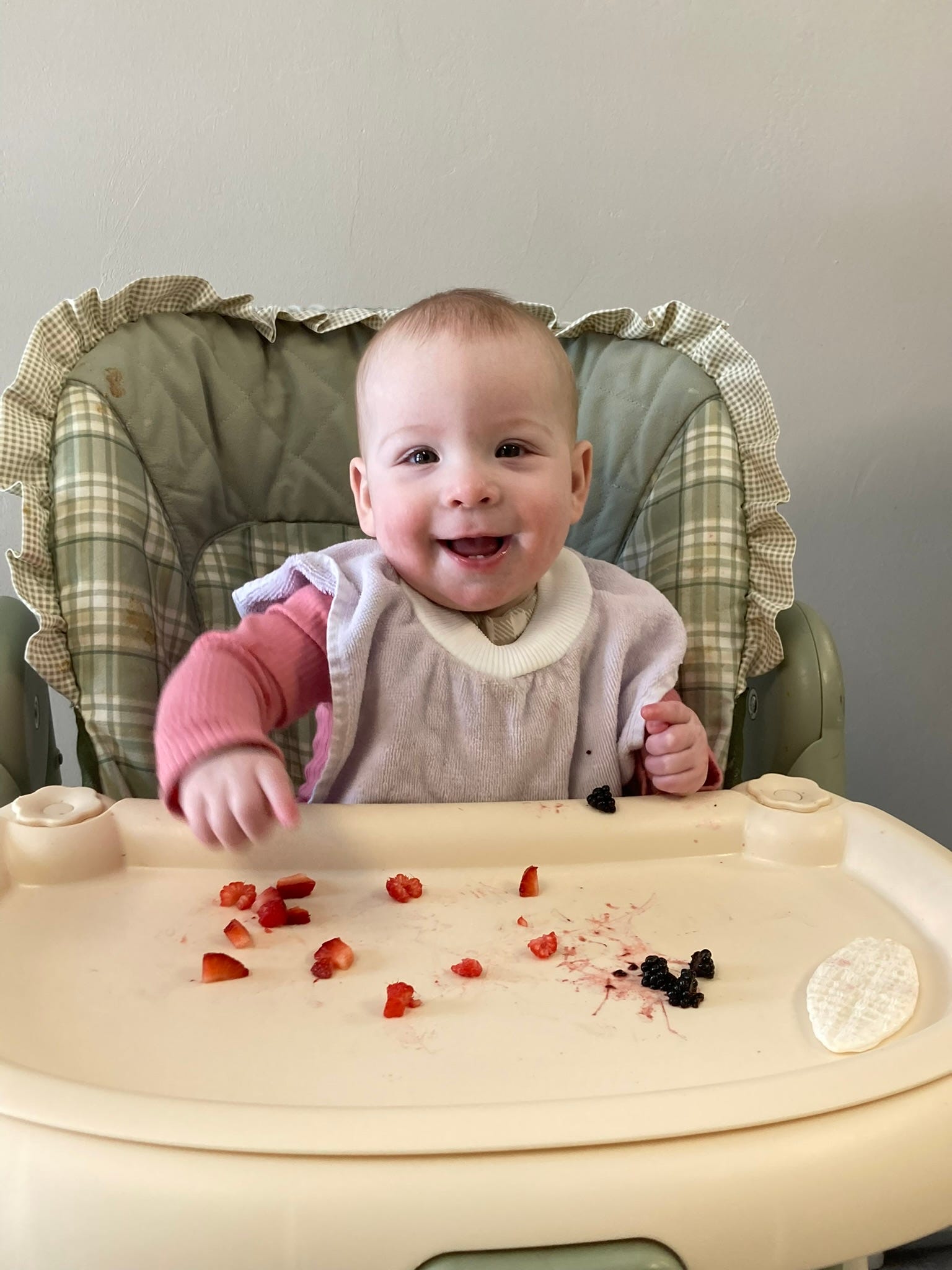 They also sent me this one of you pushing fruit around in the high chair (very little, if anything is making it to your stomach still). It’s wild seeing you in that chair. When we first toured daycare a few weeks before you started there were three little girls in a lineup of high chairs like that. I remember how they all looked over at us as we entered. They were probably about your age now but they seemed giant to me at the time — five months goes by too quickly.