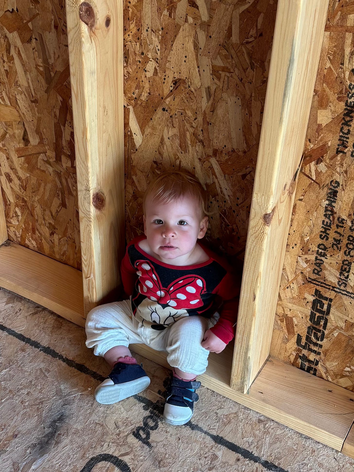 You also sleep a lot and seem a little more energetic by the time I come home early to see you. We walk around the construction together where they’ve drawn on the floor where things will go — the counters, the bookshelves, the refrigerator. Upstairs in the tower you try to make seat out of the unfisshed wall.