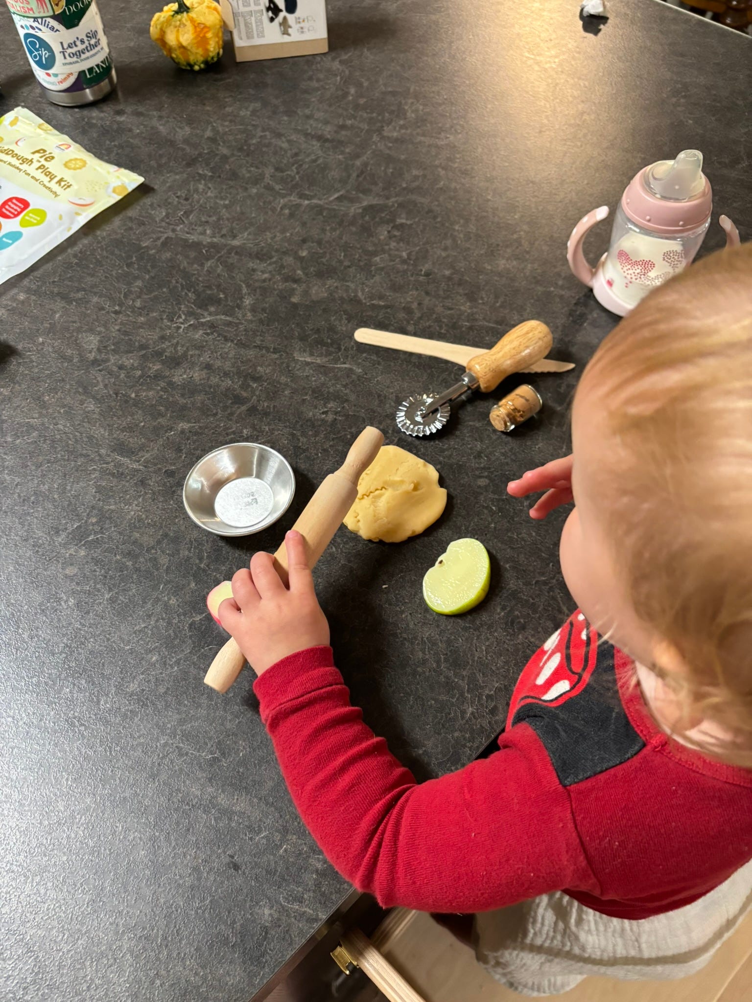 You wake up with a high fever and are clearly feeling it. MorMor watches you while I go to work. Together you go on walks, build Legos, and make your first (play-doh) apple pie.