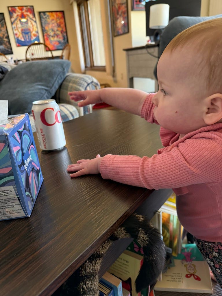 By one o’clock this afternoon, I’m picking up you and your 101.4 degree fever and taking you home. You must’ve felt it coming on, though you seemed fine early this morning. A little Tylenol and food, and we do okay all afternoon. You still have plenty of energy to stand up and play and reach for my Diet Coke.