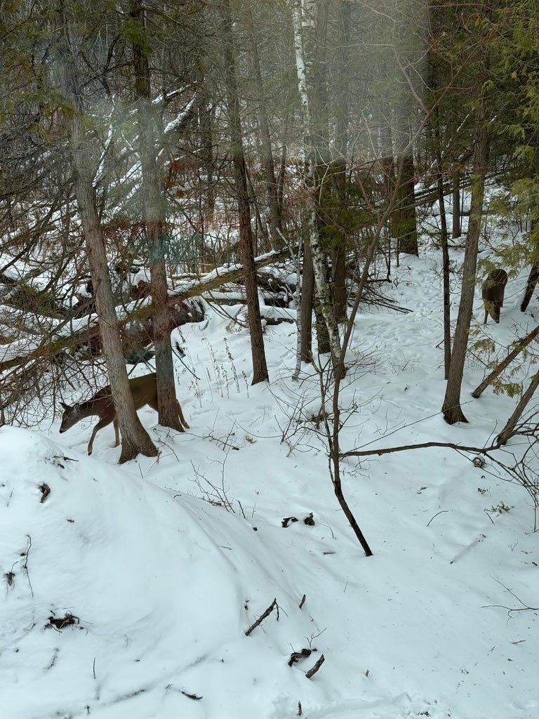I work from home, from my tower, today for the first time. I take a picture of the deer that pass below the window.