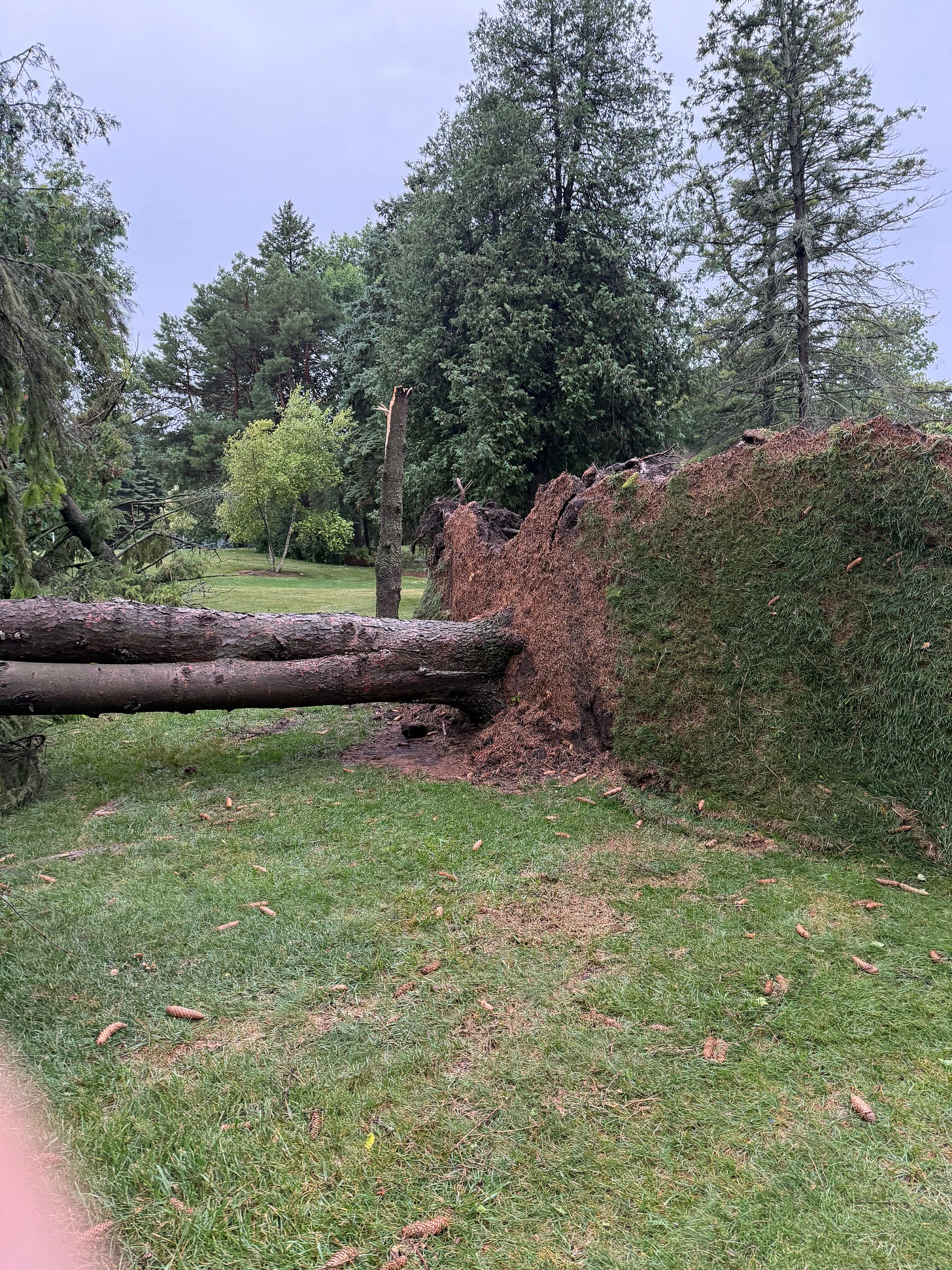 A high-wind afternoon storm caused a lot of damage this afternoon. Thankfully, not to our condo or car, but there must’ve been twenty trees down at Rocky Shores. Huge ones, roots torn from the ground, lying across the road. A couple did fall on condo roofs. And cars.