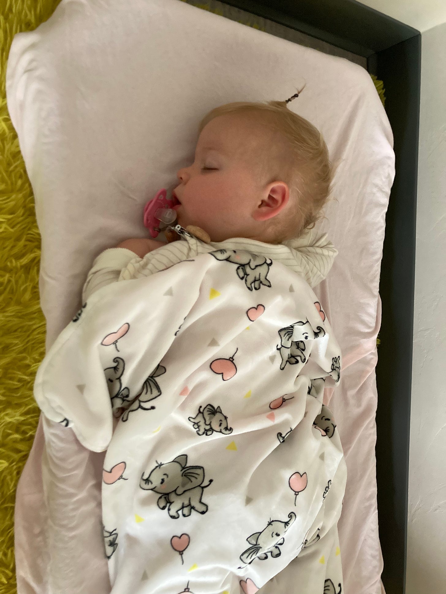 Then she texts me a picture of you napping on your cot. She says, “She must’ve worn herself out today too, cause she’s sleeping hard. I don’t think she’s moved since she fell asleep.”