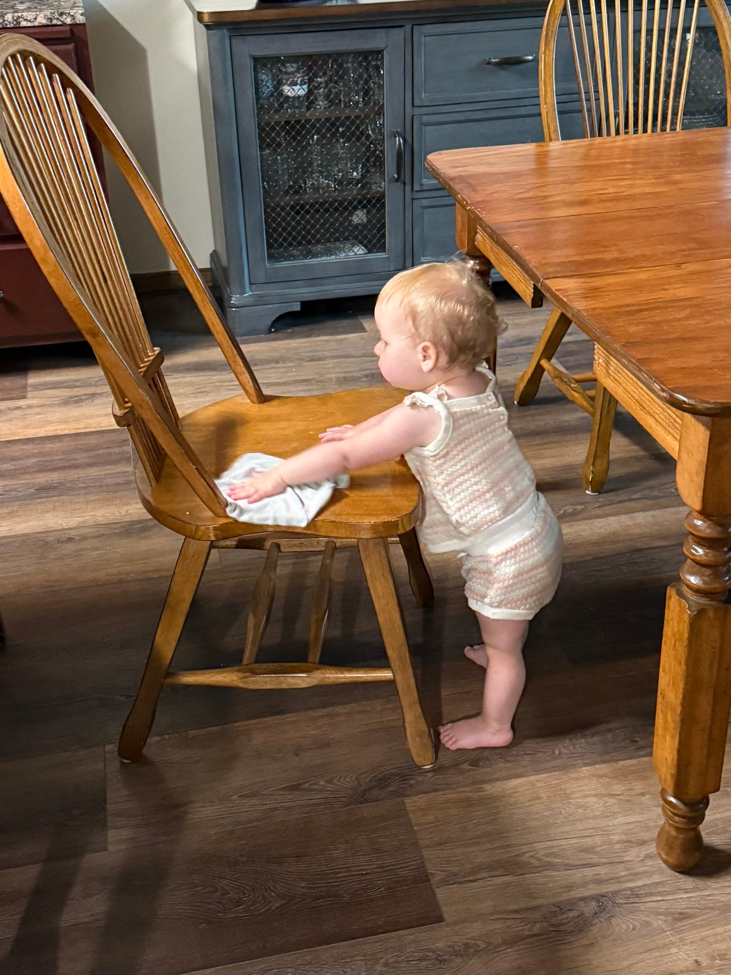 When we get back from an evening at the cottage — and a very important discussion on the overlooked question of whether we should have a door at the base of the stairs in our future home — I fold laundry before your bath time. You wander off, and I find you with a rag wiping down the kitchen chair. It is so sweet.