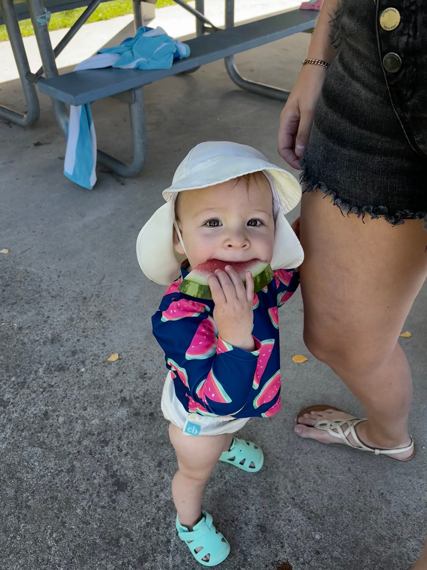 You eat watermelon by the slice at an afternoon gathering with our cousins at the beach. It’s especially picturesque since you’re wearing your watermelon swimsuit. You do keep dropping the slices in the grass and dirt and then picking up and carrying on eating.