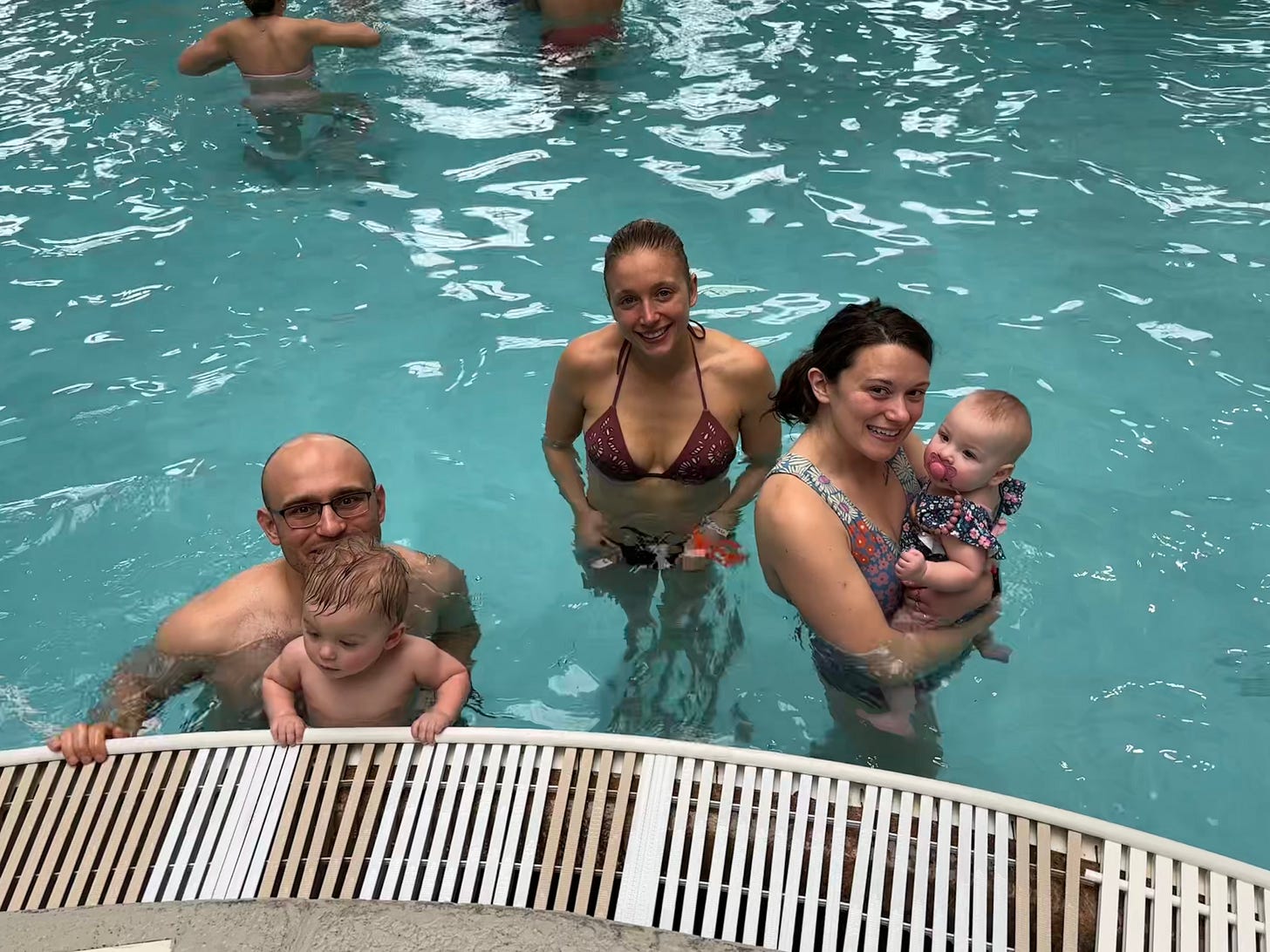 After that, we went into the lazy river with Cappi as our tube-mate. You leaned back in my lap as your eyes got heavy and I had to strategically block you from random spouts and buckets dumping water in the river. We did two laps, got out, and you basically fell asleep on my shoulder on the way back to our table. It was probably tiring and overstimulating, but you were more curious than upset today so I’ll take it as a win.