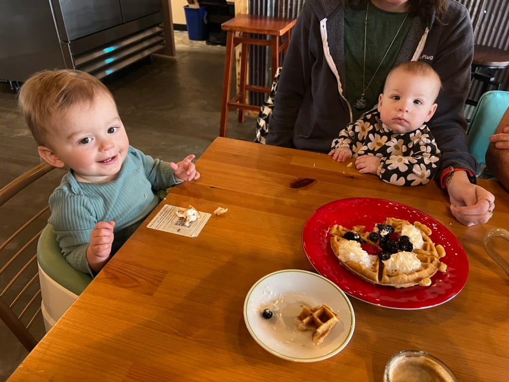 This morning we eat waffles at Hodge Podge with Uncle Wes and Kai before roadtripping again. You two are noticing each other more and more. I hold you up to him across the table and you start babbling to him.