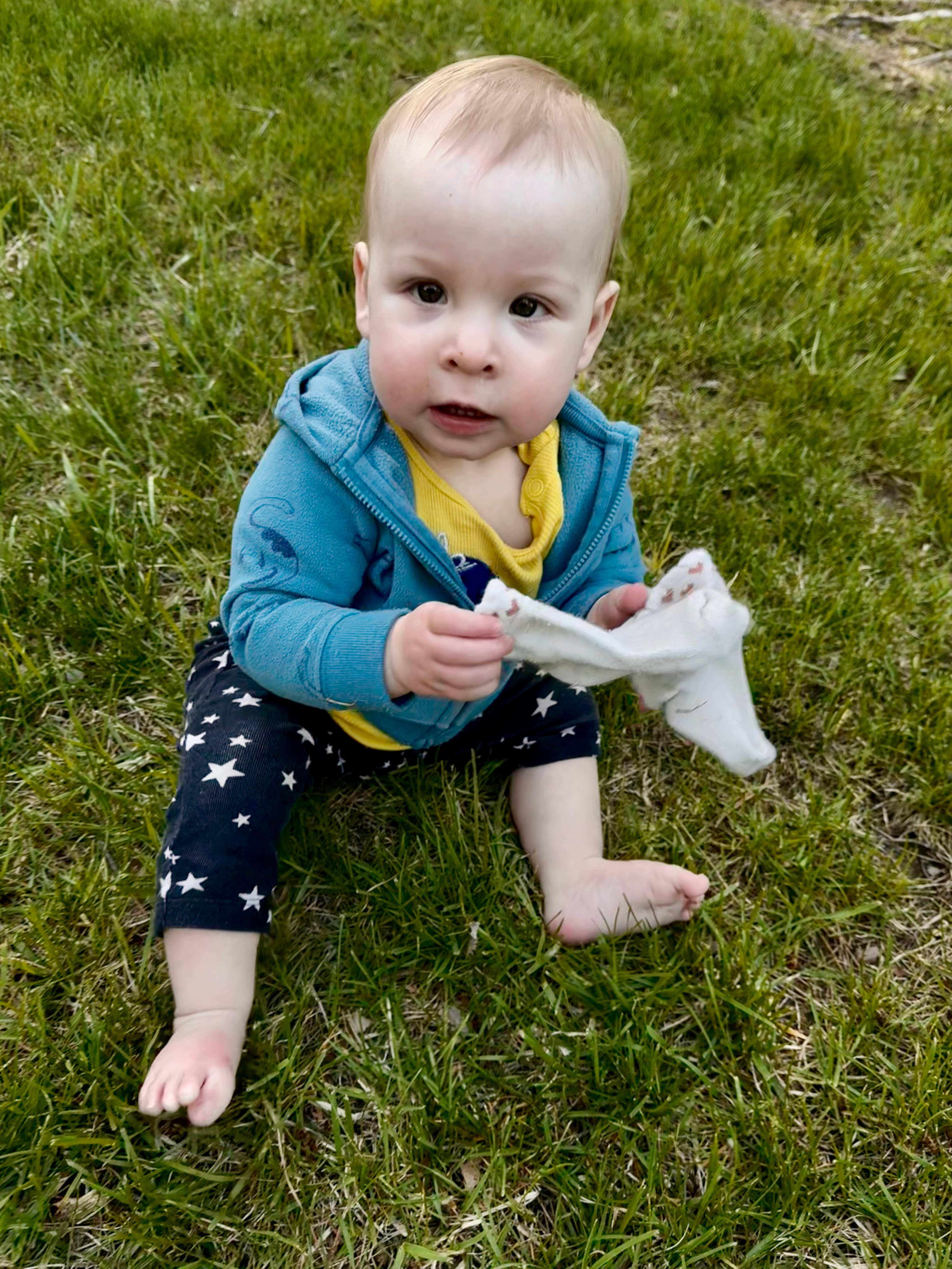 You crawl from the grass to the woodchips, chasing a stick that I call a magic wand. You wave it around. You have dirt on your feet. You’ve pulled off your socks at the first opportunity.